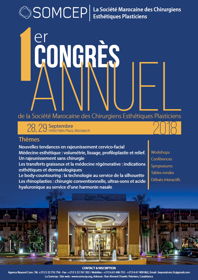 La SOMCEP, Société Marocaine des Chirurgiens esthétiques plasticiens, organise son 1er Congrès le 28 et 29 septembre dans la très belle ville ocre, Marrakech. Carrefour de civilisation et capitale touristique du Royaume qui est la terre de tolérance et l’espace de pluralisme culturel et ethnique. Incarnant les traditions et la modernité sous le règne de Sa Majesté le Roi Mohammed VI que Dieu l’assiste et le glorifie.